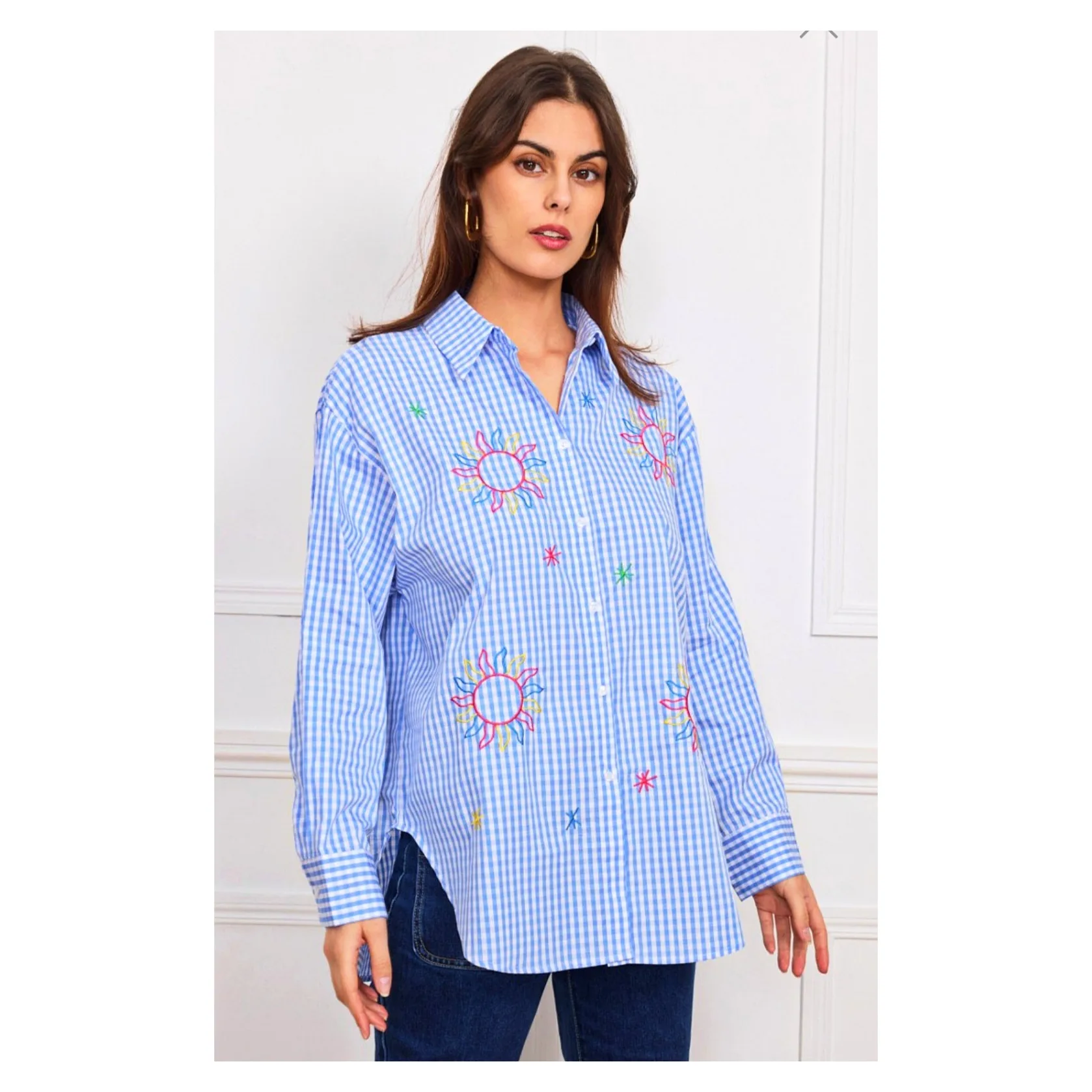 Πουκάμισο μακρύ καρό 100% βαμβάκι. Μακρύ μανίκι. Γιακάς. Κουμπί στη μανσέτα. Διακοσμημένο με κεντημένους ήλιους. Σε ίσια γραμμή. Κλείσιμο μπροστά με κουμπιά.