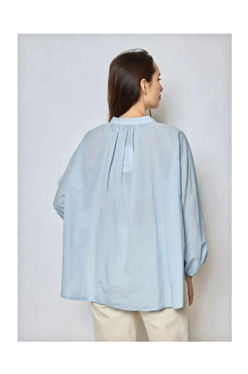 Sunny studio Πουκάμισο 100% βαμβάκι. Μακρύ φουσκωτό μανίκι. Μάο γιακάς. Διακοσμημένο με χρυσά κεντήματα. Σε άνετη γραμμή. Κλείσιμο μπροστά με κουμπιά.