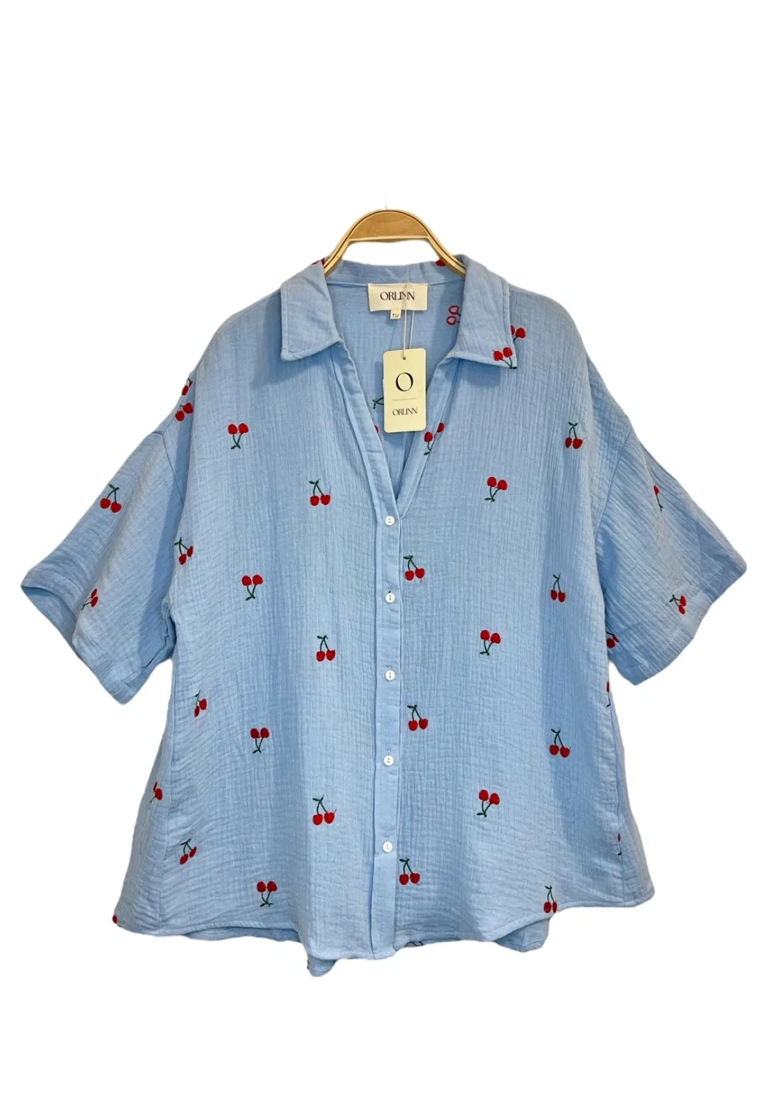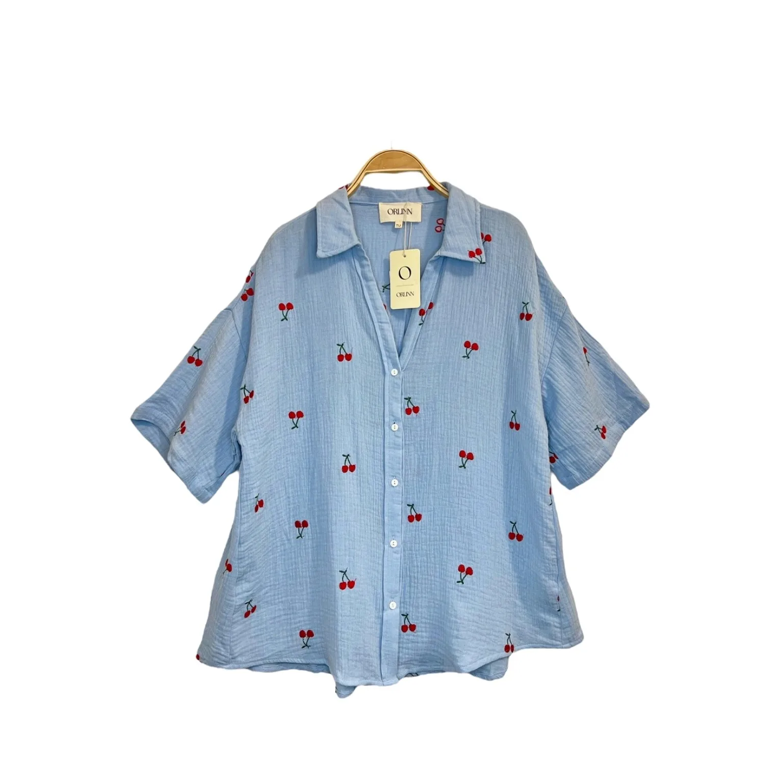 Orlinn paris Πουκάμισο μακρύ 100% βαμβάκι. Κοντό μανίκι. Γιακάς και λαιμόκοψη V. Διακοσμημένο με κεντημένα κεράσια. Σε άνετη γραμμή. Κλείσιμο μπροστά με κουμπιά.