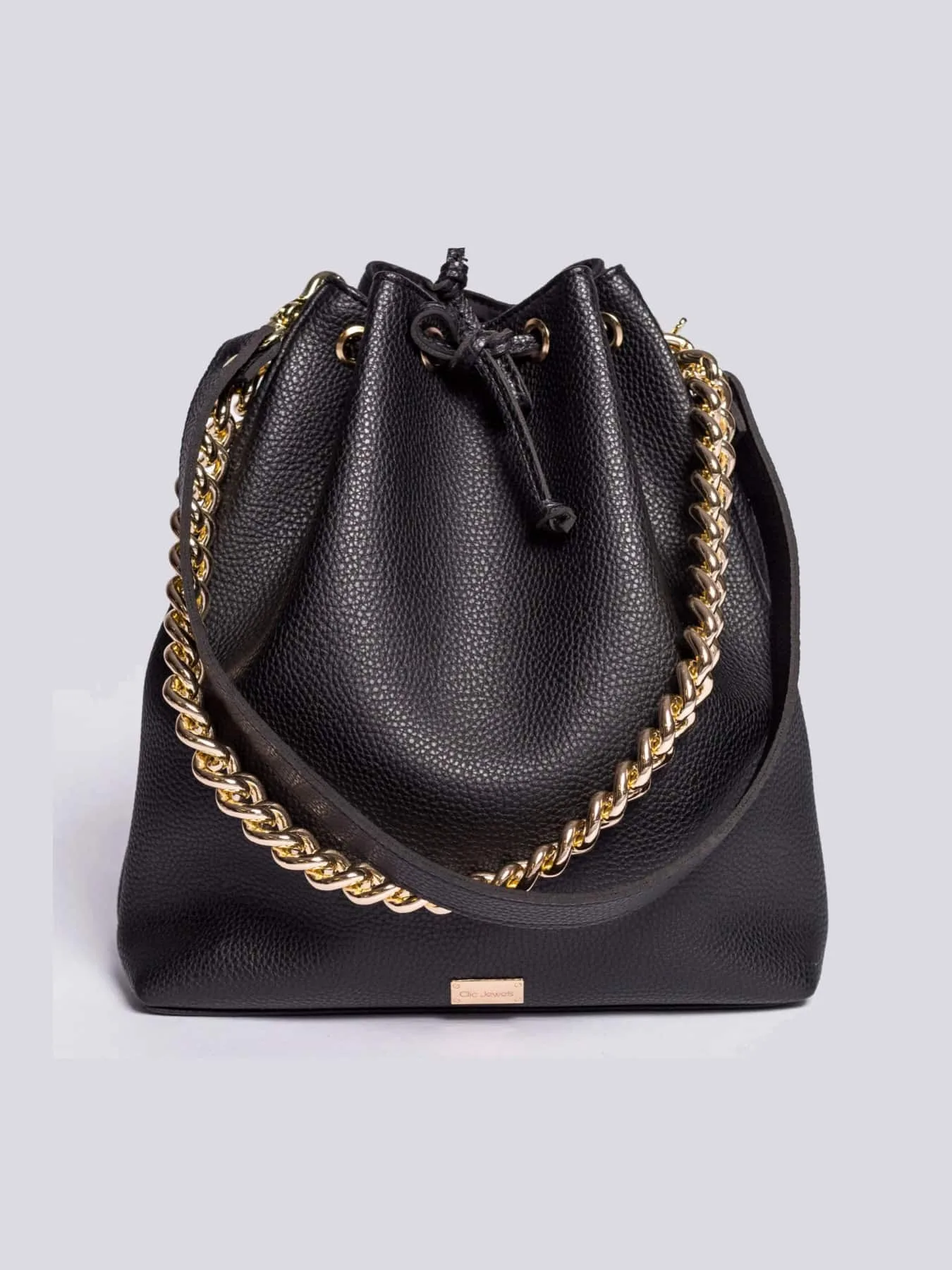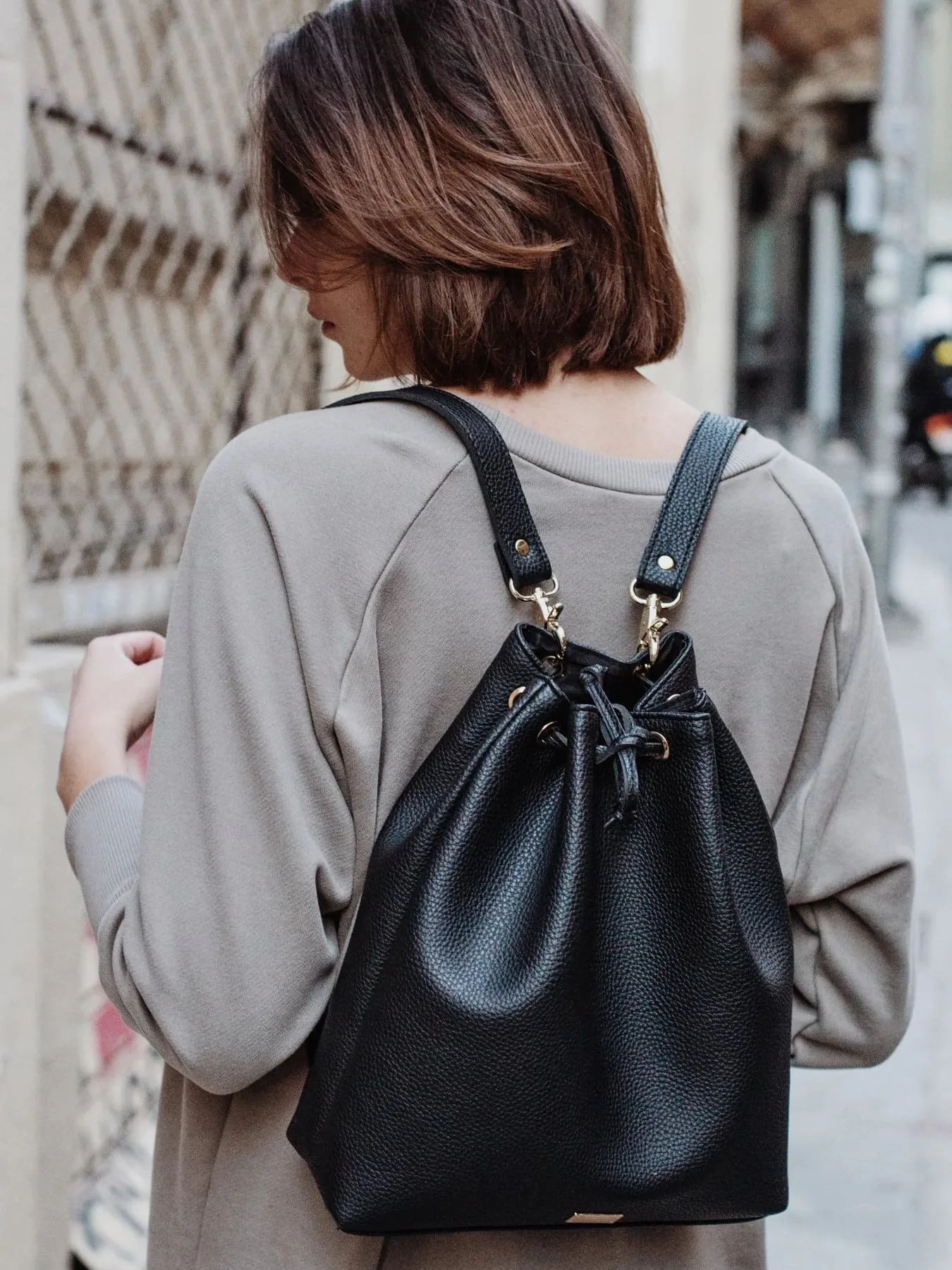 This unique design combines two different styles of bags : the classic Bucketbag and the comfortable Backpack. The two adjustable leather straps of 75cm each allows you to carry all day and with a quick change to transform it into the style of the bag you prefer. The color of the metallics is bronze and it has an internal pocket with zipper. Closes with a safety hidden in the upper part of the bag.